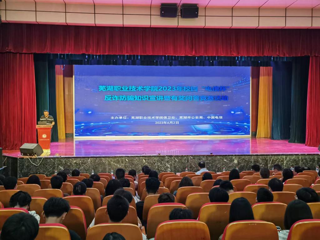 根据安徽省学校安全生产专项领导小组办公室《关于开展2023年全省教育系统“安全生产月”活动的通知》和《芜湖职业技术学院“无诈学校”建设工作实施方案》要求,为有效遏制电信网络诈骗犯罪高发态势,切实加强全校师生防范电信网络诈骗宣传教育,全面增强师生防范电信网络诈骗意识。6月2日下午,学校联合中国电信芜湖公司、芜湖市公安局反诈中心在文津校区大礼堂举办了以“反诈防骗、青春同行”为主题的校园“电信杯”反诈防骗知识宣讲暨有奖问答竞赛活动。学校党委委员、宣传部部长曾友山、学生处、团委、保卫处、各二级学院负责人和学生代表共600余人参加了此次活动。